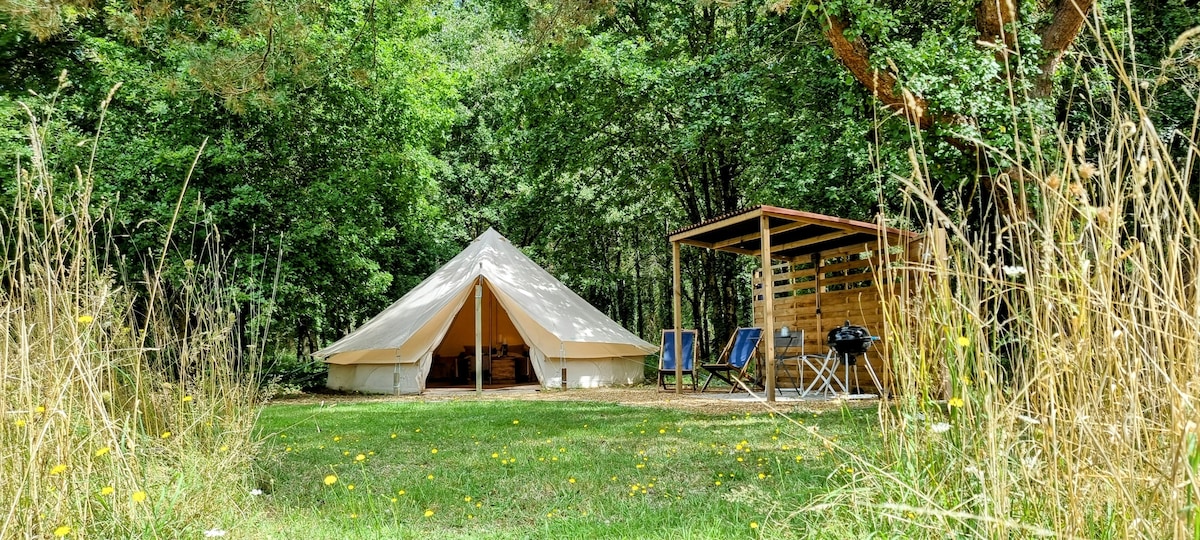 Mūsų varpelio palapinė La Fortinerie yra pačiame pačiame pačiūžoje. Įsikūręs miškingoje stovyklavimo aikštelėje „La Fortinerie“, jame yra ramus interjeras su dvigule lova, svetainės zona, mažas šaldytuvas, arbatos/kavos gaminimo įranga su privačiomis lauko sėdimomis vietomis ir kepsninių zona. 2020 m. atnaujinta iki 6 metrų palapinės, kurioje yra daug vietos. Prieiga prie bendro naudojimo pilnai įrengtos virtuvės, 3 bendrų vonios kambarių ir erdvių su bomos ugniagesių duobės zona, vandens zona ir miškingomis pievomis.