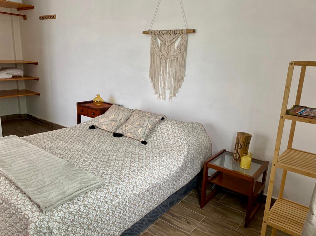 Sveiki atvykę į mūsų kaimišką prieglobstį, kuriame vešli gamta susilieja su kvapą gniaužiančiais vaizdais. Šis kambarys siūlo jaukią patirtį poroms ar draugams, su rankų darbo detalėmis ir šilta dekoracija tarp žalumos. Pabuskite paukščių giesmėse ir tyrinėkite gamtos takus arba tiesiog atsipalaiduokite privačioje verandoje. Laukiame jūsų nepamirštamos kelionės į gamtos grožį Moyobamba!