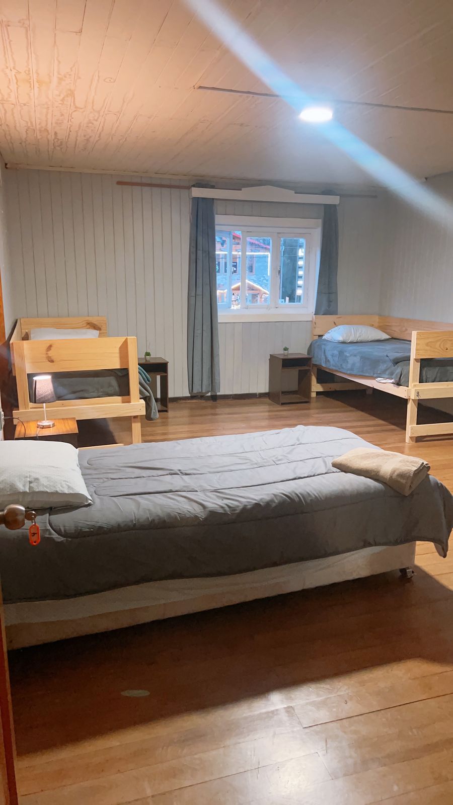 Trivietis šeimyninis kambarys nakvynės namuose, esančiame llanquihue, ramiame gyvenamajame rajone, maždaug už 50 metrų nuo Llanquihue ežero ir jo kranto. 12 min. pėsčiomis iki traukinių stoties