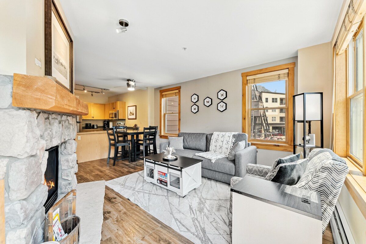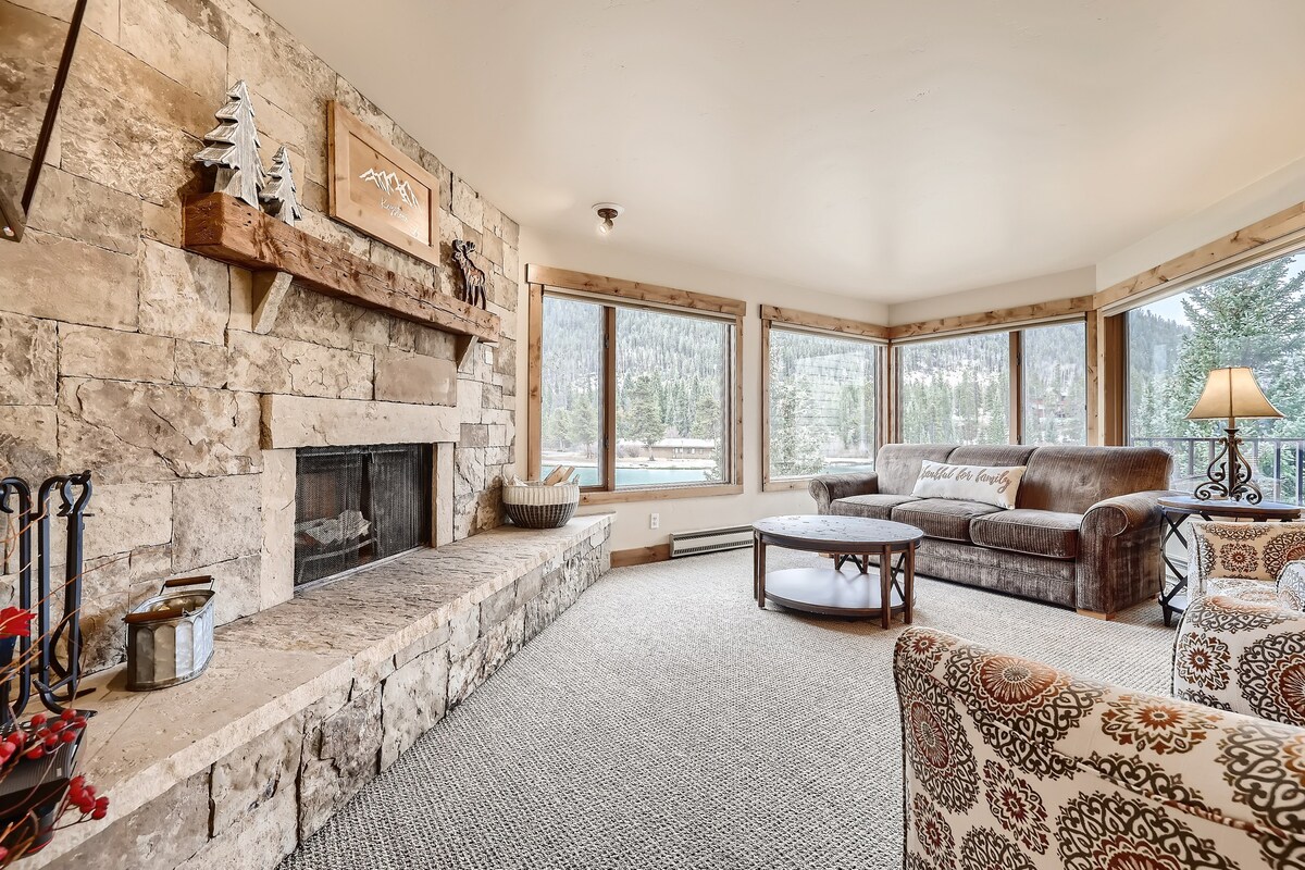 Neseniai renovuotas, prabangaus apartamentų lygio butas River Run kaime, Keystone, už kelių žingsnių nuo gondolos su vaizdu į kalnus. Įskaičiuota: pilnai įrengta virtuvė, patalynė, židinys, skliautinės lubos, balkonas. Mažiau nei 2 minutės pėsčiomis iki Gondolos. Grindjuostės šildymas, grindų ventiliatoriai, nėra oro kondicionieriaus. Wi-Fi: itin greitas pakopa: 800 Mbps atsisiuntimas/ 20 Mbps įkėlimas. 1 požeminė automobilių stovėjimo aikštelė, 1 slidinėjimo spintelė, 2 sūkurinės vonios ir 1 didelis šildomas baseinas kieme. PASTABA: liftas neveiks iki 26-02-21.