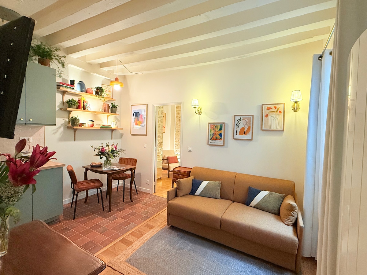 Šis istorinis butas 2019 m. buvo prabangiai atnaujintas specialiais baldais. Jei perstatymas turi daugiau nei 400 metų istoriją, iki tol tai buvo garsaus buvusio ministro, parlamento nario ir prezidento Mitterrando kampanijos vadovo, kuris taip pat gyveno už 20 m, rezidencija. Įsikūręs mažoje gatvėje, ramioje, bet netoli visko, 6 min. kelio pėsčiomis nuo RER tiesiai į oro uostus arba Versalį, 50 m iki metro ir tik 100 m iki Notre-Dame. Covid: šeimininkai ir valytoja yra paskiepyti „Pfizer“.