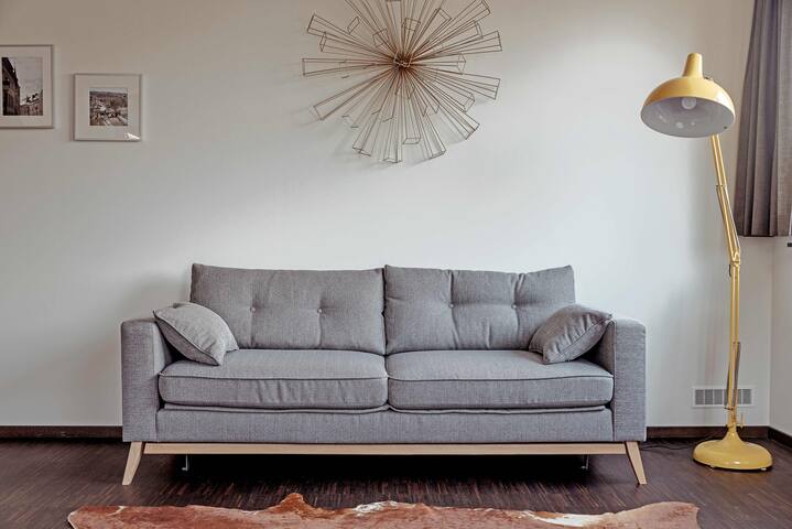 Išskirtinis lofto stiliaus butas su prabangia dvigule lova (160 x 200 cm). Svetainės zonoje yra sofa, patogus fotelis ir kavos staliukas. Šiame būste garso izoliacija yra akustinės durys ir dideli trigubo stiklo langai, užtikrinantys privatumą ir išskirtinumą. Rūsyje yra skalbimo įranga. Jame yra viskas, ko reikia patogiai ir produktyviai viešnagei Liuksemburge.