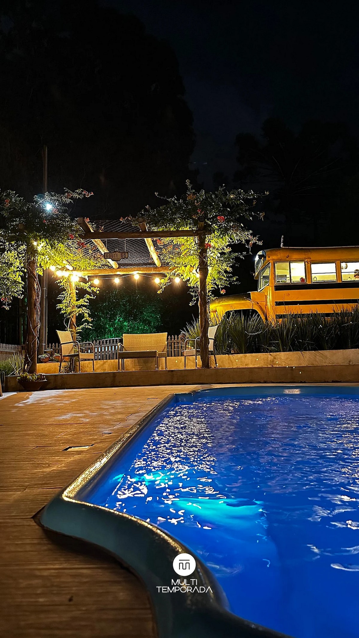 Multitemporada presents AquaTour - SpaBus - Capinzal/SC. A school bus transformed into a cabin offers comfort and adventure, with a heated pool, hot tub, fire pit, and a tranquil river. Enjoy the trail to the waterfall and a fully equipped kitchen – or homemade dishes prepared by partners. The perfect retreat to relax and create unforgettable moments!