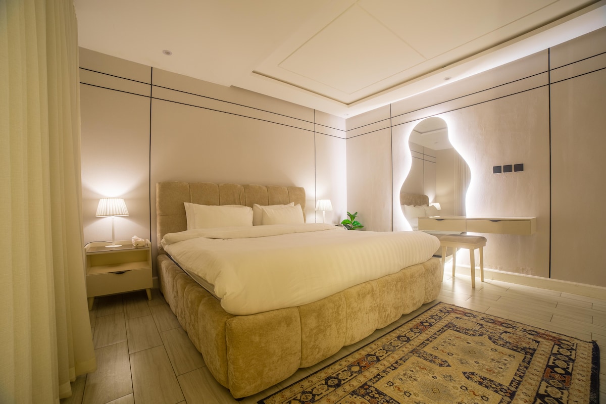 Prabangus būstas pačioje Rijado širdyje, netoli King Khalid oro uosto ir Yarmouk metro stoties, idealioje vietoje su greita prieiga prie populiariausių miesto lankytinų vietų. Stilinga ir rami studija Modern, kurioje yra minkšta lova ir patogios viešbučio pagalvės, didelė sofa ir aukštos kokybės QLED ekranas. Erdvi lauko aikštė, kurioje yra lauko kino teatras su projektoriumi, kepsnine ir židiniu, taip pat moderni dviejų asmenų sūkurinė vonia. 5G ir internetas , YouTube, Netflix, OSN Mėgaukitės prenumeratomis Greitas ir stabilus verslui ar laisvalaikiui. Garso izoliacija, savarankiškas atvykimas ir automobilių stovėjimo aikštelė priešais pastatą ir rūsyje.