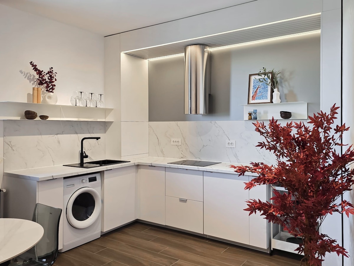 Spacious luxury 40 sqm studio in the heart of Bucharest, just steps from Old Town Bucharest. Recently renovated, the apartment features elegant decor, a comfortable queen-size bed (180×200 cm), a stylish sofa, a cozy balcony, a large fully equipped kitchen and a spacious bathroom with rain shower. Hosted by a Superhost with over 7 years of experience. Metro right next to the building. Coffee shop, cake shop, mini markets, fast food, ATM and currency exchange on the ground floor.