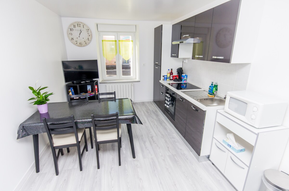 100% suremontuotas butas Pont à Mousson, rami, gera vieta. - Įrengta virtuvė (vitro kaitlentė, orkaitė, šaldytuvas/šaldiklis, Senséo, mikrobangų krosnelė ir kt.) - Lova 160x200 + 1 sofa BZ 140x190 (svetainė) - 100 cm išmanioji televizija (Youtube ir kt.) -WIFI - Atskiras tualetas - Dviračių kiemas - Nemokama automobilio stovėjimo aikštelė gatvėje. - 5 min. pėsčiomis iki traukinių stoties, parduotuvių ir Place Duroc. - 10 minučių pėsčiomis iki Premonstratensiečių abatijos - 15 minučių nuo Lorraine TGV traukinių stoties - 20 minučių nuo Meco ir Nansi (traukiniu arba automobiliu) - Atvykimas/išvykimas