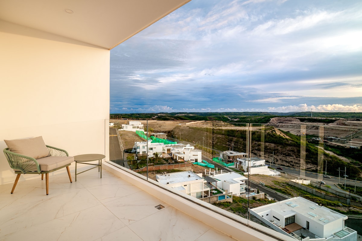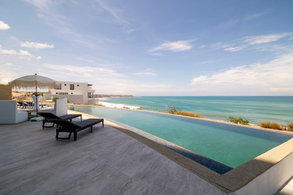 Prabangus 2 miegamųjų, 2 vonios kambarių butas su vaizdu į vandenyną 5 žvaigždučių viešbutyje „POSEIDON“. Į jį įeina į jūrą atsuktas baseinas ir sūkurinė vonia. Svetainė/Terasa/Virtuvė/ TV/ Wi-Fi . Meistras : dvigulė lova Antras miegamasis: dvigulė lova. Pilnai įrengta virtuvė/skalbimo mašina / automobilių stovėjimo aikštelė. Baseinas yra puiki vieta orams su šeima . Privatus amatininkų paplūdimys. Išėjimas iš jūros. Pastatas yra geriausioje, naujoje ir saugiausioje Manta „Via Barbasquillo“ vietovėje.