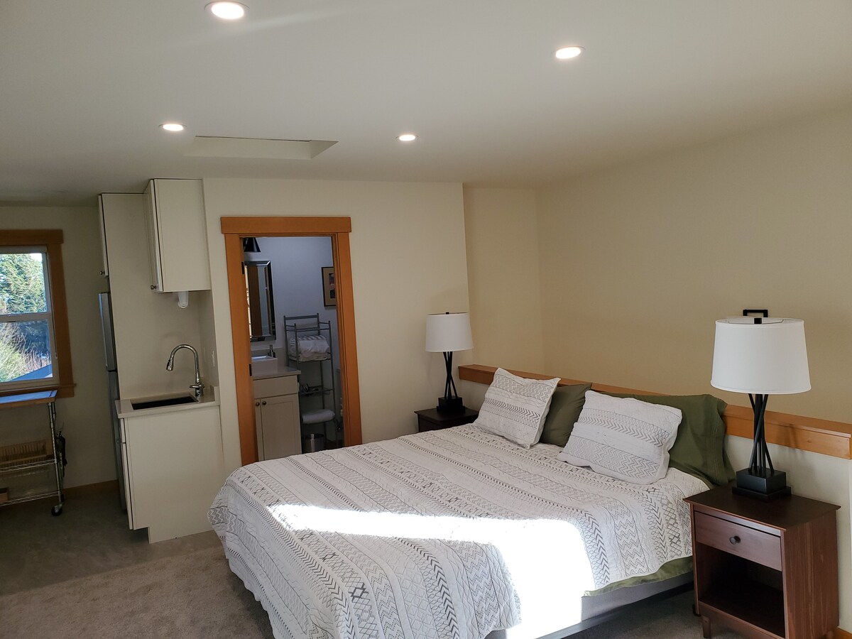 Vaizdas į sodą, šviesūs ir modernūs „svečių namai“ už 5 min. kelio nuo greitkelio ir už 10 min. kelio nuo kelto vakarinėje Bremertono dalyje. Erdvėje yra atskiras butas, atskirtas nuo mūsų pagrindinio namo, pritvirtintas prie pagrindinės gatvės, įsikūręs tarp kedrų ir eglių palei purvo įlanką, jungiančią su Puget Sound. Iš kambario atsiveria visas 270 laipsnių vaizdas į sodus ir medžius, karalienės dydžio murfinė lova, šaldytuvas, kriauklė, mikrobangų krosnelė, malkinė viryklė ir vonios kambarys su 16colių lauko lietaus dušu.