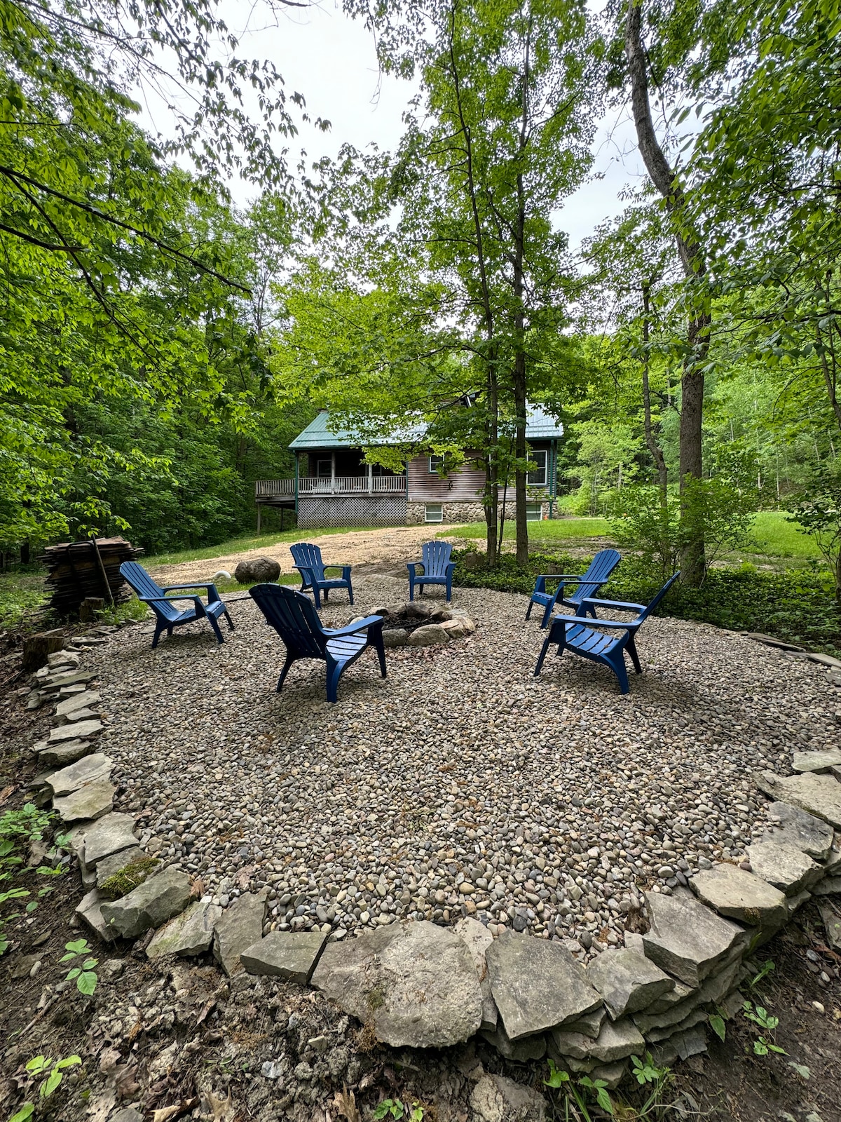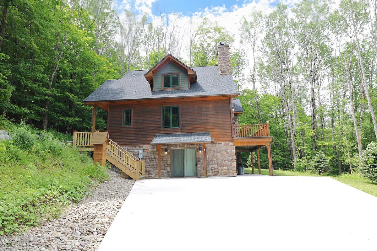 Ellicottville Chalet on a secluded 10 acre lot in the woods w/ The Ultimate Game Room! Our chalet is perfect for 3 or 4 families or 4-5 couples. The Ultimate Game Room: indoor pickle ball, ping pong, 2 cornhole sets, and pop o shot (radiant floor heated). 25 year old min renter age and 13 guests maximum please. AWD needed in winter to park near chalet (we have a lower parking area for non-AWD). Beds: 1 King, 2 queen, 2 full, and 3 twin.
