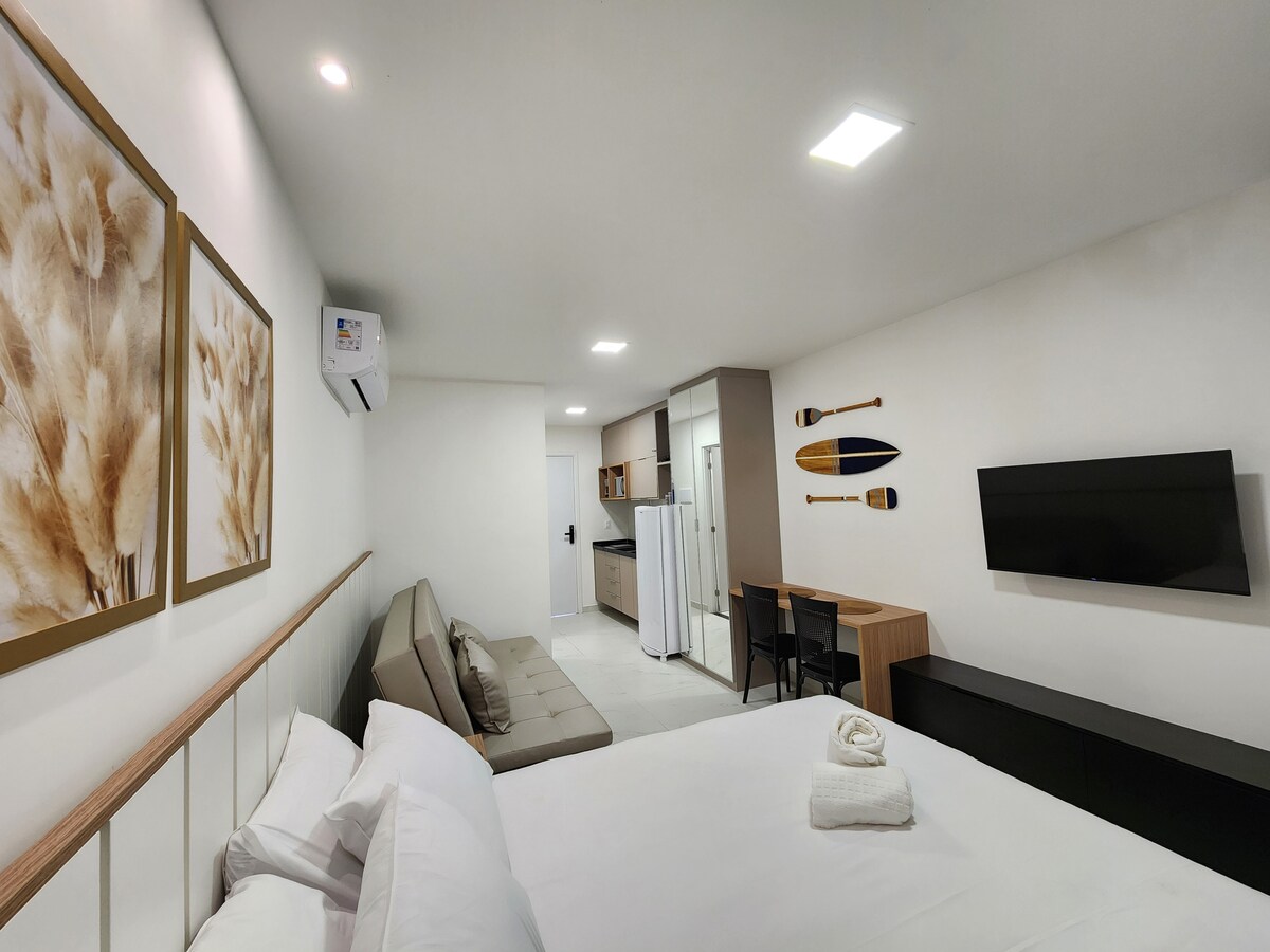 Jaukus butas su atvira virtuve, svetaine su sofa-lova, oro kondicionieriumi, išmaniuoju televizoriumi, balkonu ir miegamuoju su dvigule lova, oro kondicionieriumi ir spinta Virtuvė su visais įrankiais, mikrobangų krosnele, trintuvu, sumuštinių aparatu, šaldytuvu, kavos aparatu, indais ir orine gruzdintuve Enxoval Dujinis šildomas dušas Wi-Fi Laisvalaikio zona ant stogo su vandens veidrodžiu, vaizdu į jūrą, suaugusiųjų ir vaikų baseinu saulėlydžio pusėje Maraca Beach II yra už 50 m nuo paplūdimio, su liftu, visą parą veikiančiu konsjeržu ir prieiga prie Beira Mar