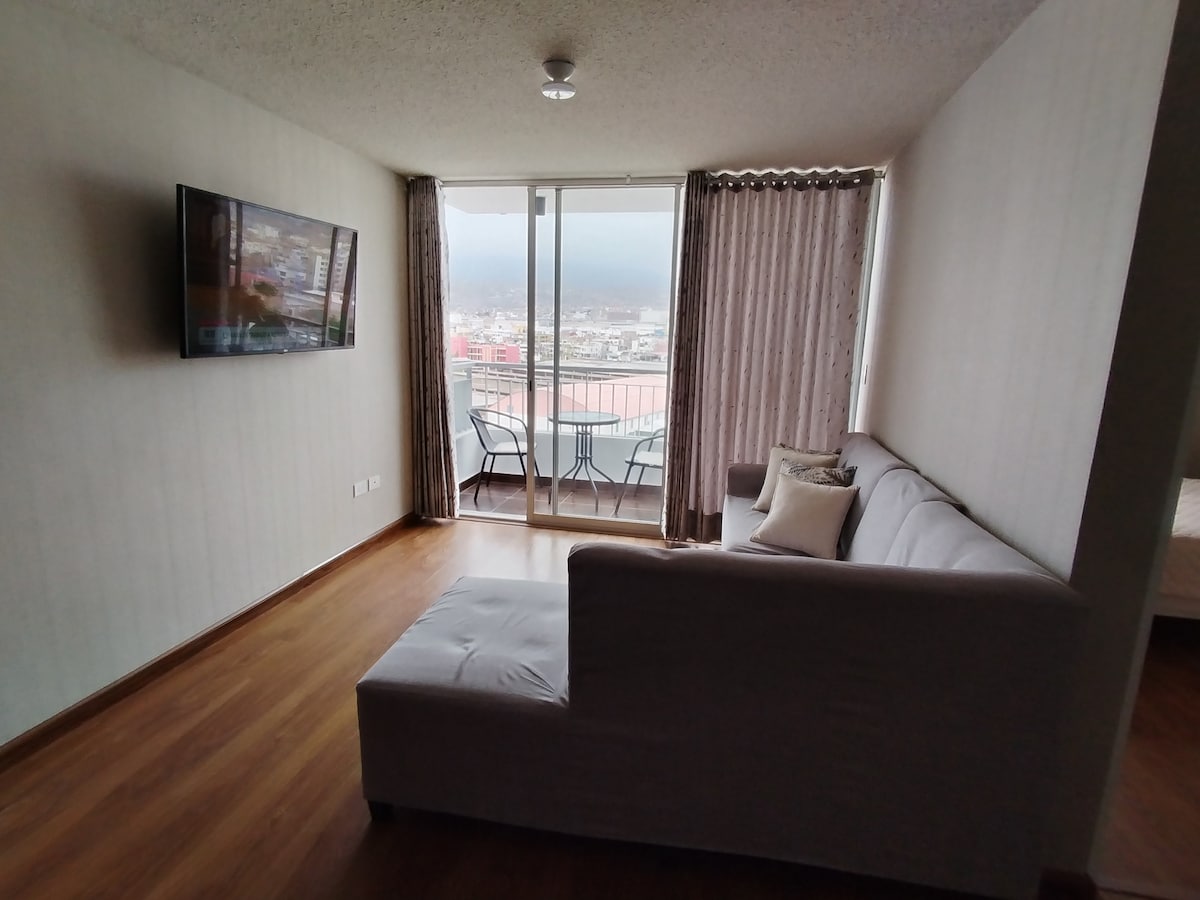 Enjoy your stay in the White City in a comfortable and bright studio just a 15-minute walk from the historic center. Ideal for enjoying Arequipa's sunny days, with views of the volcanoes from the balcony. The studio is equipped with all basic appliances. It includes a private bathroom, 24-hour hot water, and internet connection. The building features an elevator, an internal patio, and a portal with video surveillance.