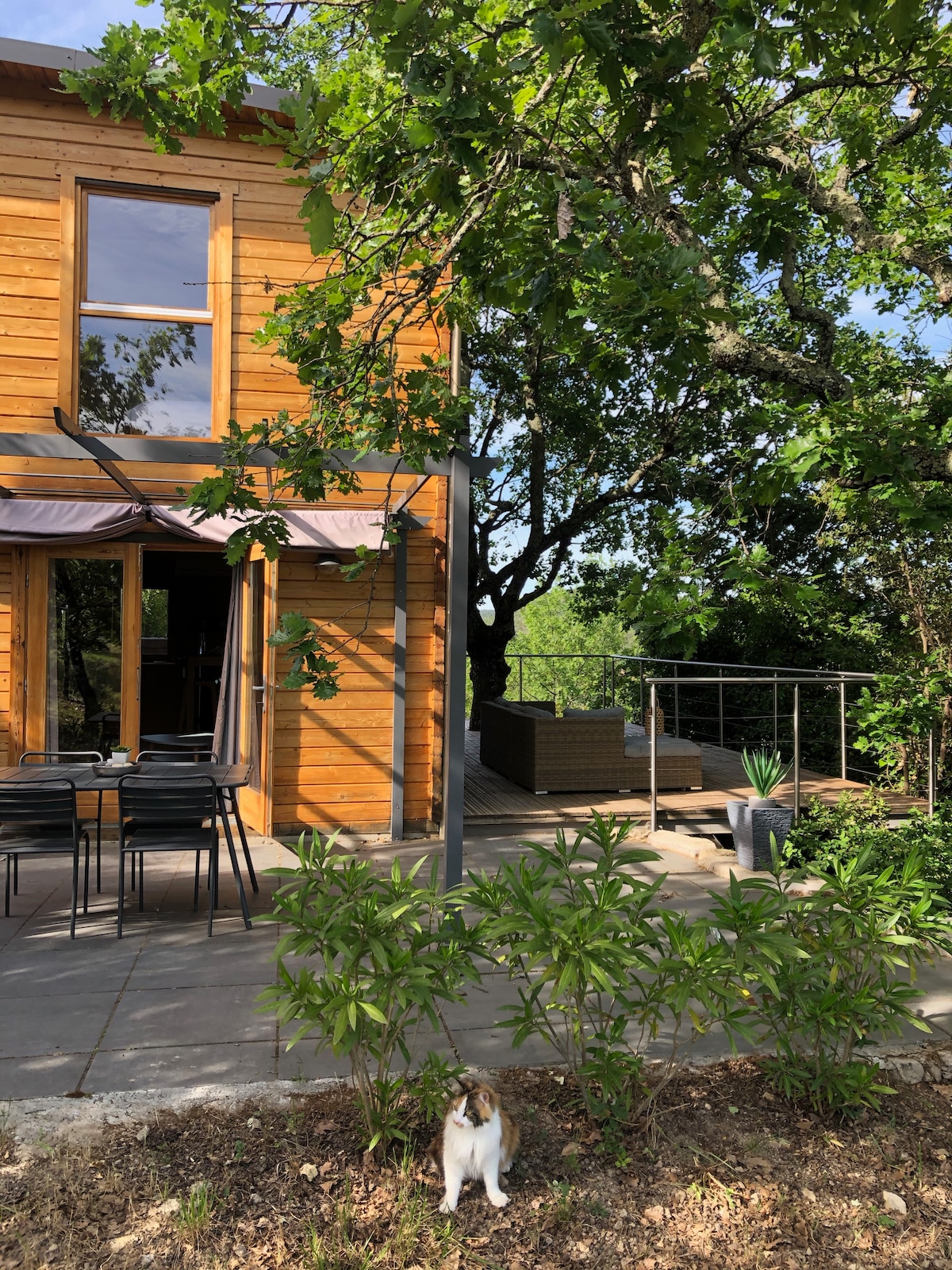 Rami, šilta ir gamtos atmosfera, idealiai tinka žaliojoje aplinkoje su panoraminiais vaizdais ir netoli parduotuvių/restoranų. Įsikūręs šalia mūsų pagrindinės gyvenamosios vietos, bet nepamiršta. Pastatyta 2 lygiuose, su 2 terasomis, įskaitant dideles terasas ant atramų medžių apsuptyje. Galite naudotis baseinu, kuriuo dalijamasi su savininkais nuo birželio iki rugsėjo. Pradinis taškas daugeliui apsilankymų ir veiklos, esančios už Ardèche Gorges gamtos rezervato ribų.