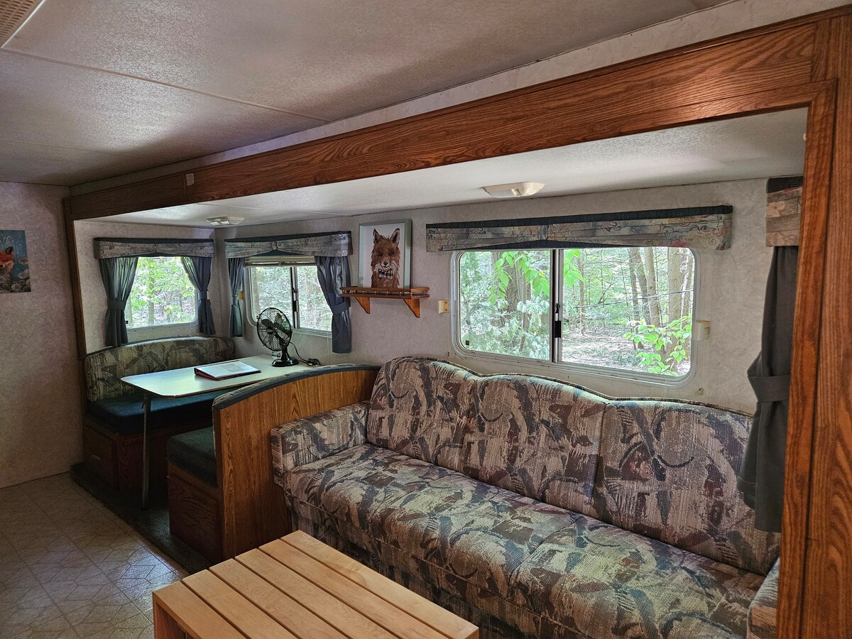 Nepamiršite ramios šios kaimiškos kelionės vietos aplinkos. Mažoje privačioje stovyklavietėje ant 200 akrų miško. Nėra belaidžio ryšio...ribota mobiliojo telefono paslauga. Įsikūręs netoli nedidelio upėtakių tvenkinio. Mėgaukitės mūsų miškais, pėsčiųjų takais, tvenkiniu ir gamta. Sėdėkite prie laužo ir klausykitės pelėdų paukščių, kurie visada dainuoja, ir daug laukinių gėlių bei augalų, kuriuos reikia ištirti. Priekaboje yra pakankamai būtiniausių reikmenų. Tačiau mes netiekiame patalynės... Atjunkite ir atsipalaiduokite!!!