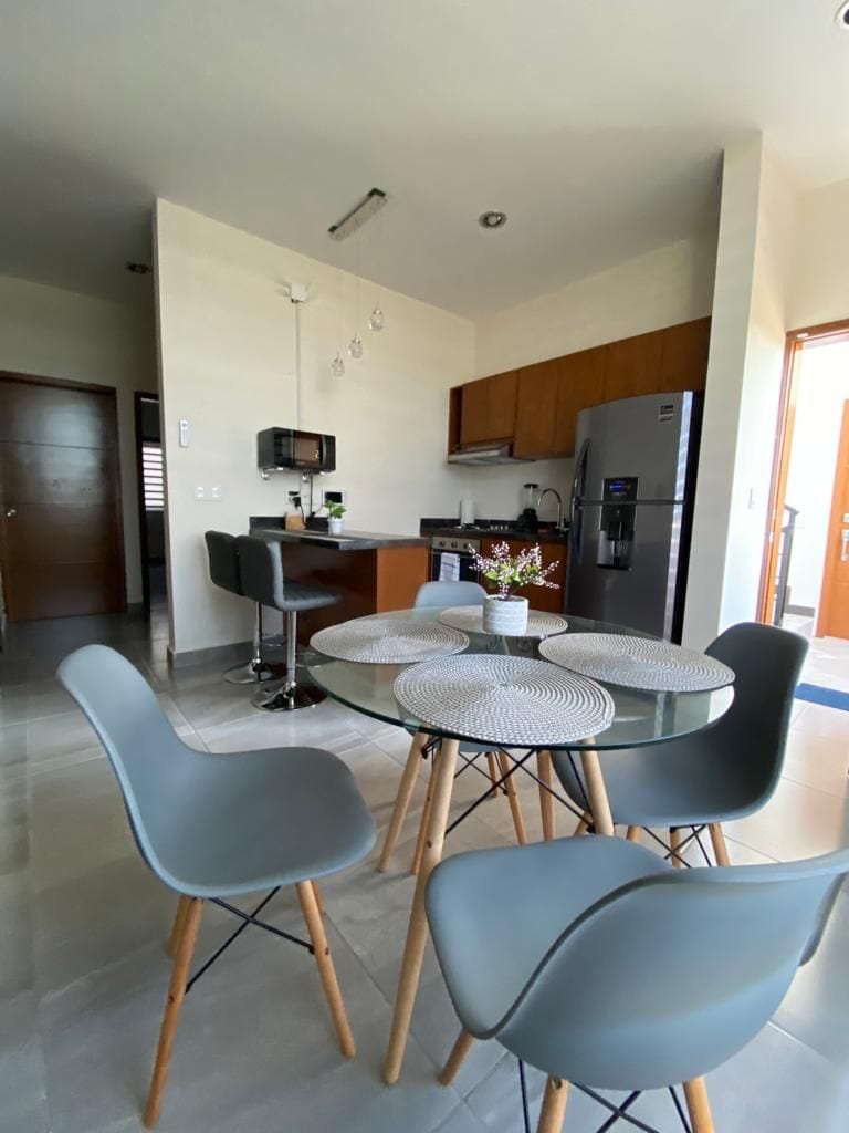 CONTAMOS CON ( 3) DEPARTAMENTOS CON LA MISMA UBICACIÓN Y DIRECCIÓN PREGUNTE POR CUALQUIERA DE ELLOS los departamento se encuentran a 7 minutos de la playa y cuentan con una habitación 2 camas matrimoniales un tocador, A/C minisplit, tv, wifi, abanico de techo una sala con un sofá una cocina completa, refrigerador, estufa, fregadero, con una barra y 3 bancos, trastes para cocinar un baño completo con agua caliente una terraza un cuarto de servicio con lavadero