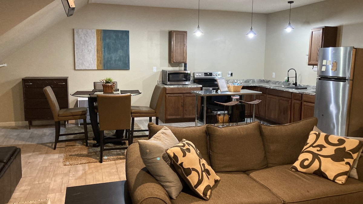 Welcome to our stylish and cozy studio, just minutes from scenic lakes and golf courses! The Luxe Studio is a perfect blend of comfort, convenience, and style. It features modern amenities like a fireplace, a 75-inch smart TV, and a luxurious queen bed, ensuring every stay is unique and memorable. For added convenience, our spacious roundabout driveway makes parking and maneuvering boats or trailers effortless. Boat charging outlets are also available for an extra $15 daily fee.