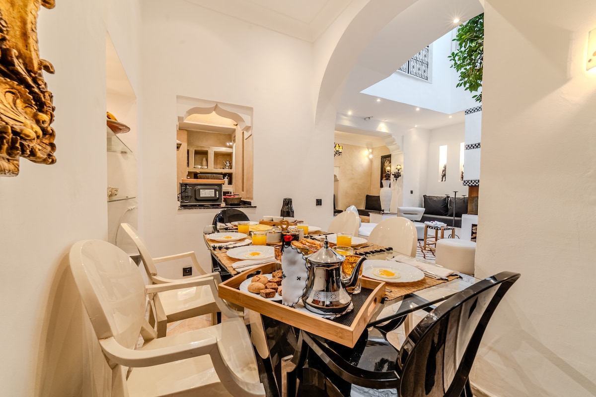 Patirkite mūsų prašmatnią, prabangią riadą Marakeše, derindami tradicinę eleganciją su šiuolaikiniu komfortu. Pirmame aukšte yra valgomasis, biblioteka, sofos, poilsio kiemas ir pilnai įrengta virtuvė. Viršuje, du miegamieji su privačiais vonios kambariais. Stogo terasa su vandens baseinu, gultais, židiniu ir nuostabiais Atlaso vaizdais. Puikiai tinka romantiškai, įsimintinai išvykai.
