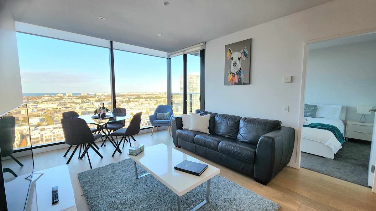 Naujas skelbimas! Patirkite aukštesnį gyvenimo lygį šiame prabangiame 2 miegamųjų mansarde aukštai virš Docklands. Mėgaukitės panoraminiu horizontu ir uosto vaizdais pro langus nuo grindų iki lubų ir erdvų balkoną. Abu miegamieji siūlo komfortą ir privatumą, taip pat specialią biuro erdvę, idealiai tinkančią darbui ar mokymuisi. Naudokitės kurorto stiliaus patogumais, įskaitant baseiną ir sporto salę. Nemokami tramvajai prie jūsų durų, kelios minutės iki CBD, Marvel stadiono ir vakarienės prie vandens. Vos už kelių žingsnių nuo Woolworths prekybos centro.