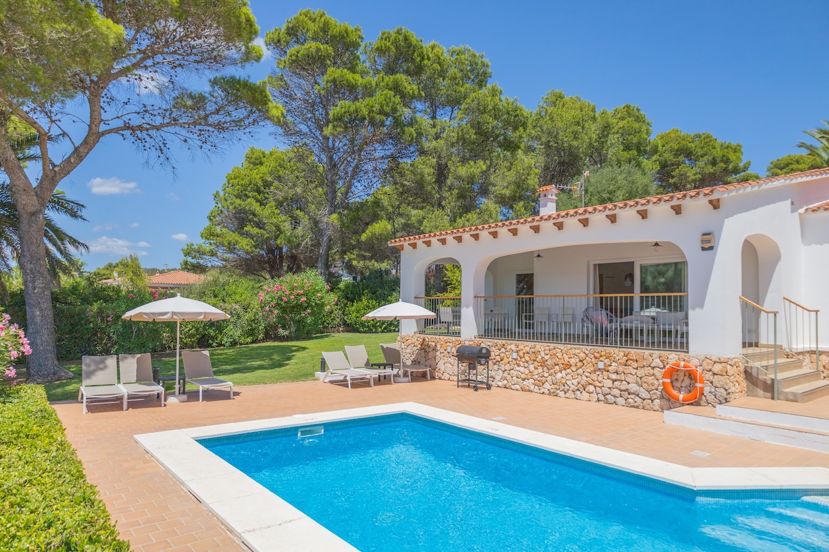 Erdvi 130 m² privati vila su 250 m² lauko erdve, esanti labai ramioje gyvenamojoje zonoje netoli Ciutadella. Vos už 4 minučių pėsčiomis rasite prekybos centrą, restoranų ir prieigą prie Cala en Brut ir Cala en Blanes paplūdimių, automobilio nereikės. Jame yra 3 dviguliai miegamieji, 2 vonios kambariai ir sofa-lova, kurioje gali apsistoti iki 8 svečių. Lauko zona su baseinu, sodu, veranda, pavėsine ir kepsnine. Įskaičiuotas oro kondicionierius, spartusis Wi-Fi, automobilių stovėjimo aikštelė, patalynė ir rankšluosčiai.