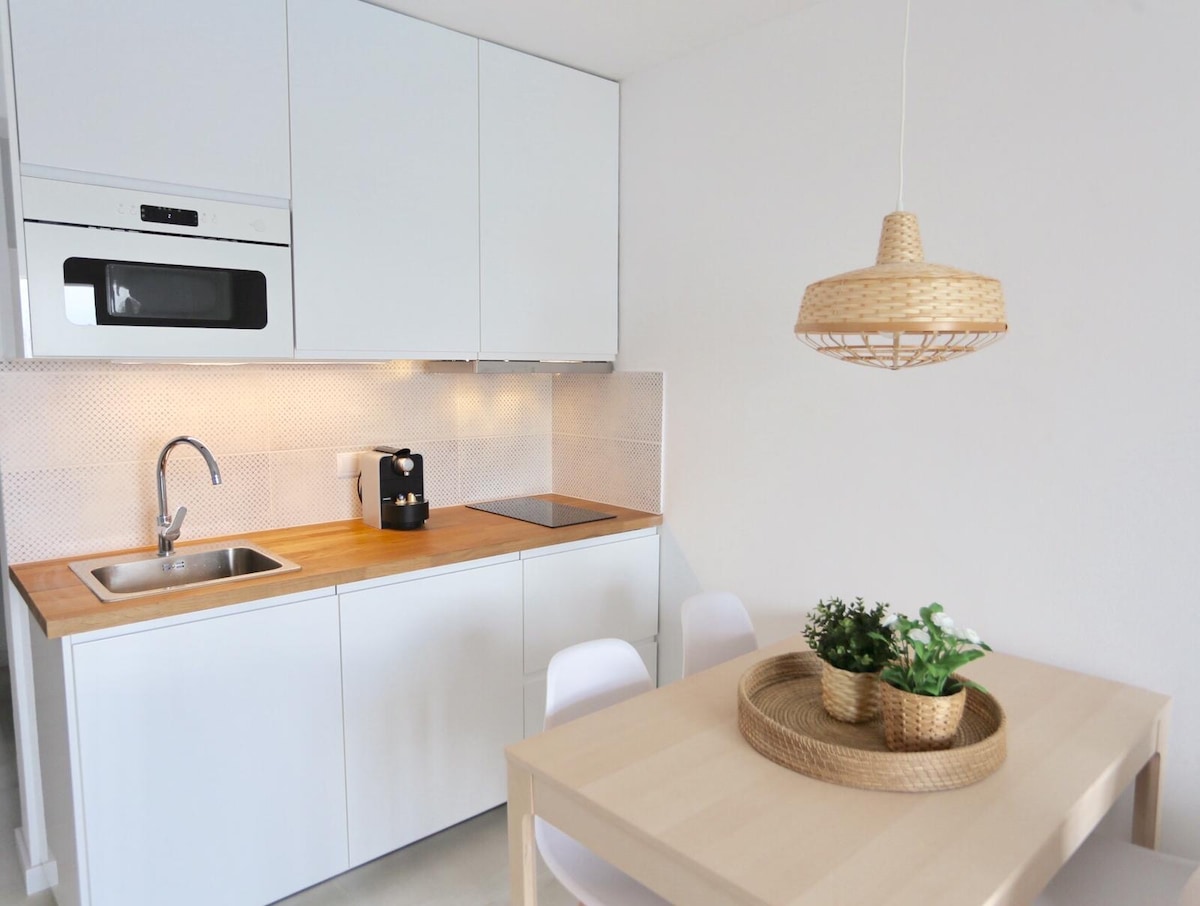 Labai jaukus butas, visiškai naujas, Cala'n Blanes parke (žr. vietą žemėlapyje), vos už kelių minučių pėsčiomis nuo įvairių įlankų. 2 suaugusiems su 1 vaiko/kūdikio galimybe. 1 kambario santuoka. Pilnai įrengta virtuvė su prietaisais. Oro kondicionierius šaltas ir šilumos siurblys bei elektrinis radiatorius y . Svetainėje ir kambaryje yra televizoriai. Jame yra privati terasa, baseinas ir bendras sodas. Nemokama automobilių stovėjimo aikštelė priešais butą. Prekybos centras „Super“ yra už 3 minučių kelio pėsčiomis.