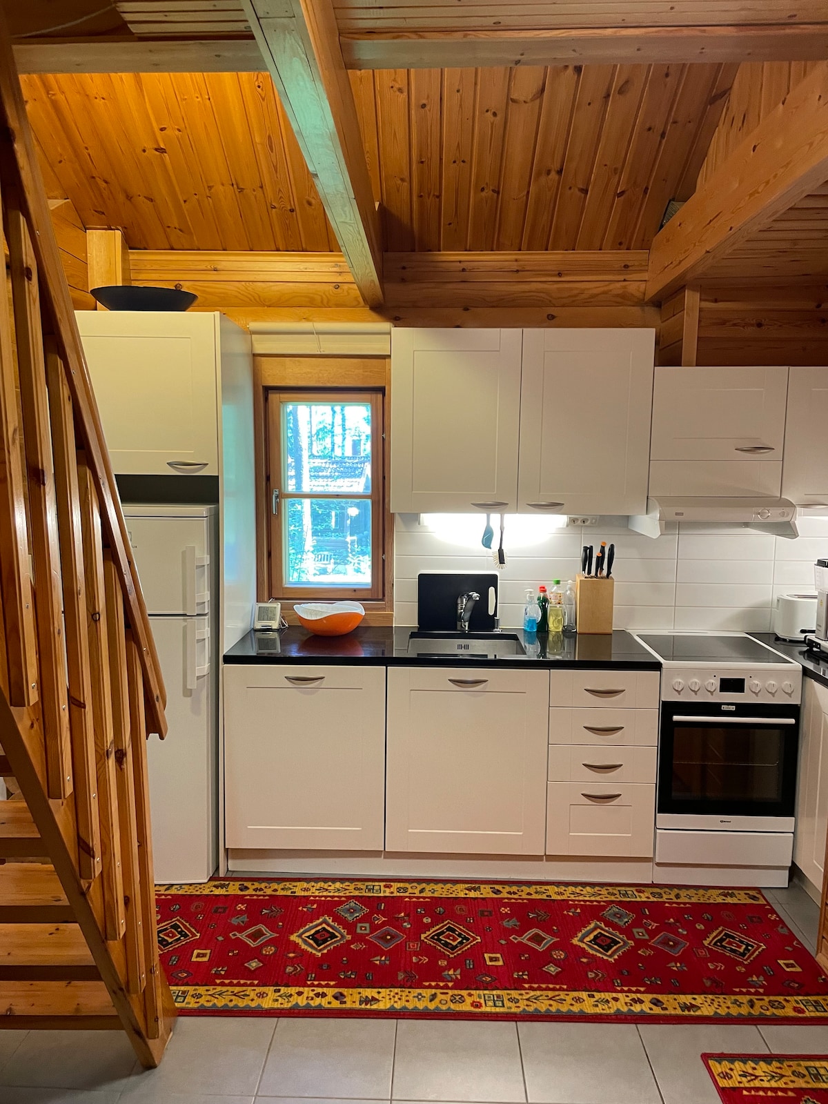 Gražus Kalkkistenkoski kotedžas. Didelėje terasoje galite kepti ant grotelių, valgyti, mėgautis vakaro saule, sėdėti ant saulės gultų arba stebėti paukščių gyvenimą ant slenksčių. Sūkurinė vonia ir pirtis yra šildomos, o atviras židinys sukuria atmosferą. Virtuvėje yra viskas, ko jums reikia, o kepsninė ir lauko laužavietė paplūdimyje leidžia gaminti įvairias atostogas. Yra karštas vanduo pirčiai ir virtuvei, geriamasis vanduo atnešamas į kotedžą skardinėse. Puucee šalia kotedžo. Automobilis gali patekti iki pat kiemo.
