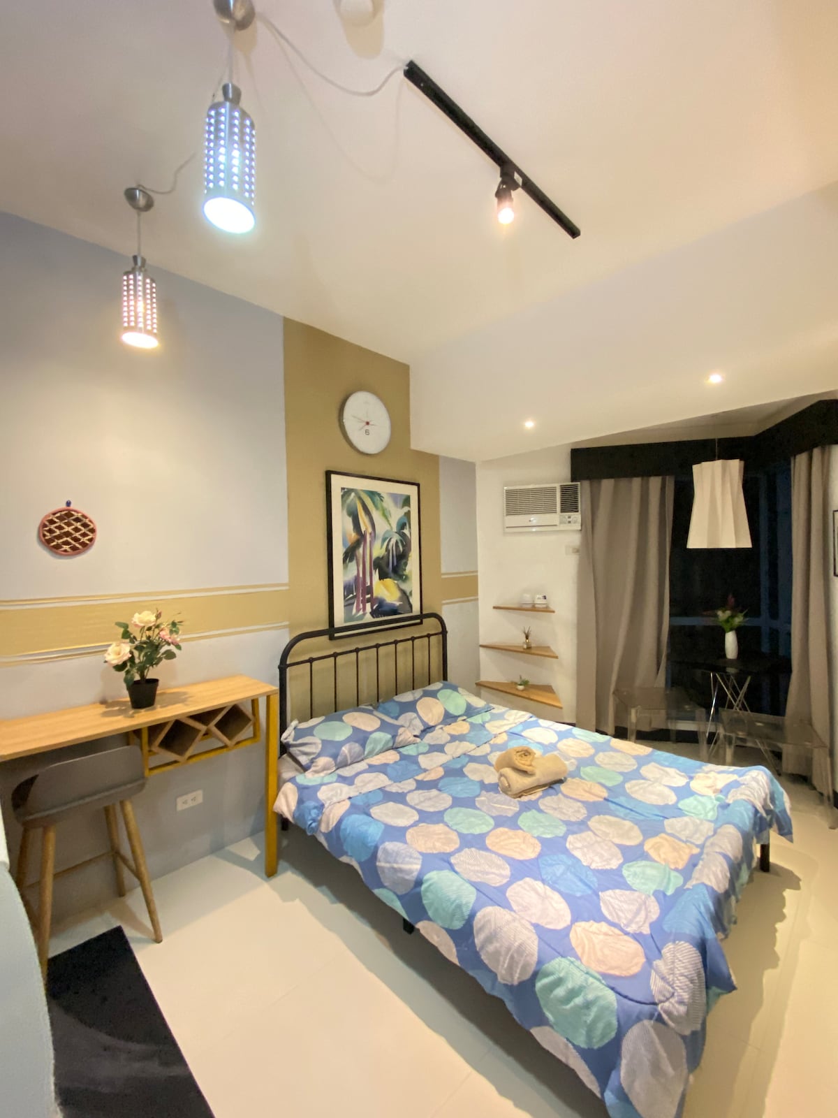 Sveiki atvykę į Cozy Nook PH at 15F Maldives Tower, Azure Urban Resort Residences! Patirkite tobulą pramoninio ir meniško dizaino derinį mūsų 2 lovų, 1 vonios kondominiume. Ši apgalvotai dekoruota erdvė sukurta taip, kad suteiktų jums komfortą ir stilių viešnagės metu. • Žaidimų konsolė: 20 000 klasikinių kelių žaidėjų žaidimų su 2 valdikliais • Stalo žaidimus • karaokę • Žaidimo kortas • 300 Mbps Wi-Fi • Balkonas su vaizdu į saulėtekio miesto panoramą • 55 colių išmanusis televizorius su „Netflix“