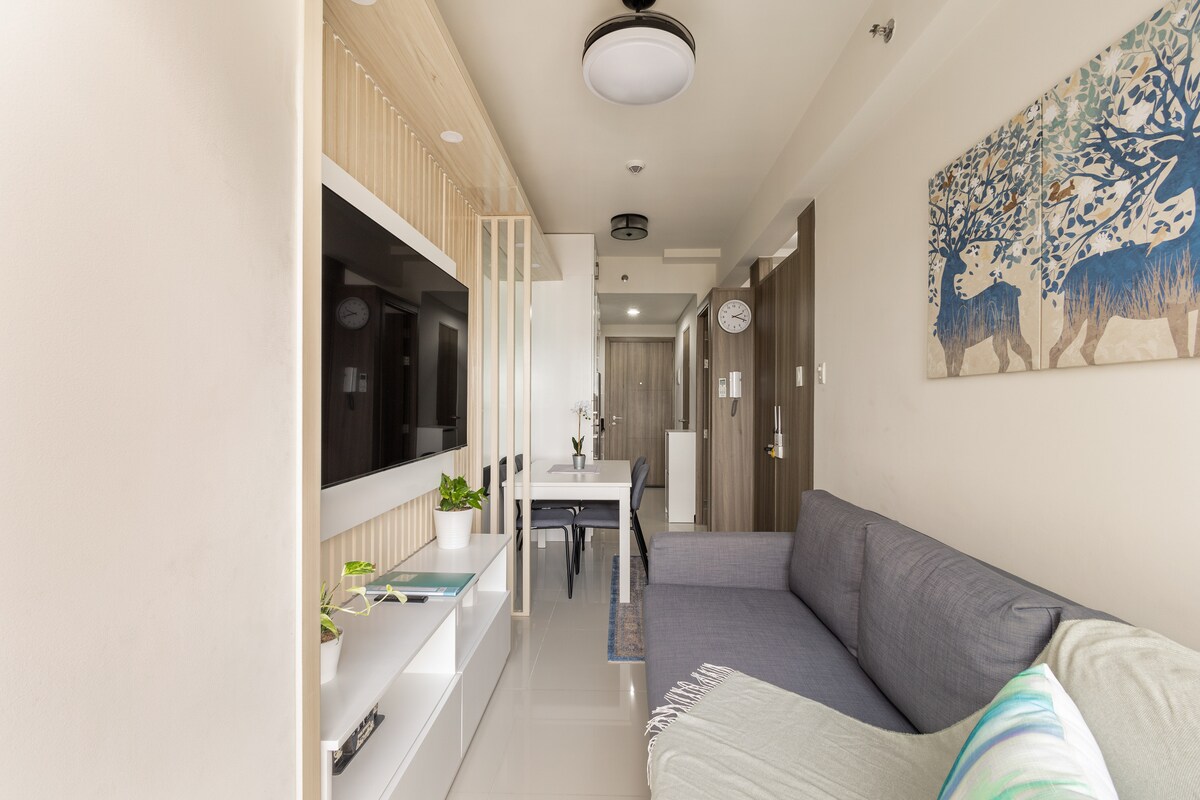 Stay in style! This 41sqm 1BR apartment offers a premium Makati lifestyle. Views: High floor with a stunning skyline view. Space: Separate living/bedroom; fits 2 adults + 2 kids. Tech: 50" Smart TV & Keyless entry. Amenities: Access to Novotel’s pool and gym. Location: Directly opposite Rockwell. Equipped with a balcony, water heater, and kitchen basics. Whether for business or family, enjoy the best of the city right at your doorstep.