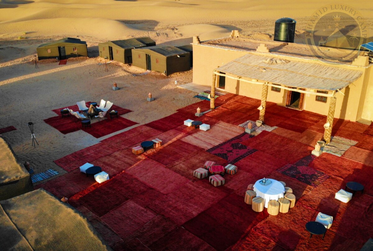 esame atokių puikių Mhamido kopų, (smėlio jūros) Maroke, bazėje ir gerokai toliau nuo numinto kelio. Stovyklas supa mažesnės kopos, užtikrinančios privatumą ir prieglobstį, kurios yra puiki vieta saulėlydžiui ir saulėtekiui .
