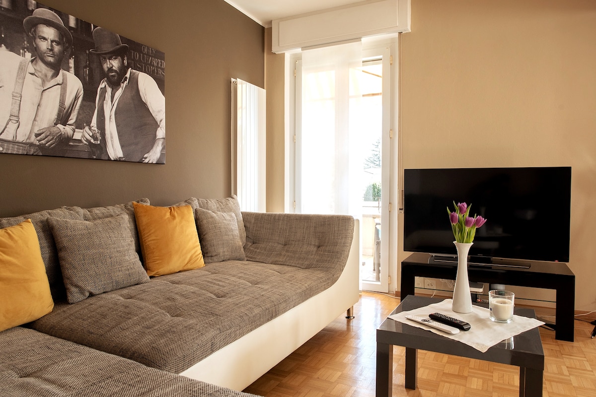 IVANA Apartment Atsipalaiduokite šioje ramioje vietoje centrinėje ir šviesioje vietoje, pėsčiomis nuo Migros, Denner, Coop, restorano ir kepyklos. 10' pėsčiomis nuo stoties arba 1' nuo autobusų stotelės (Via Sociale) Yra dengta automobilių stovėjimo aikštelė. Yra elektromobilių įkrovimas. Dvivietis balkonas, tinkamas pusryčiams arba poilsiui su vaizdu į sodą, kalnus ir ežerą. Oro kondicionierius bendroje erdvėje su papildomu mokesčiu Pn. 5 per dieną (10 valandų)