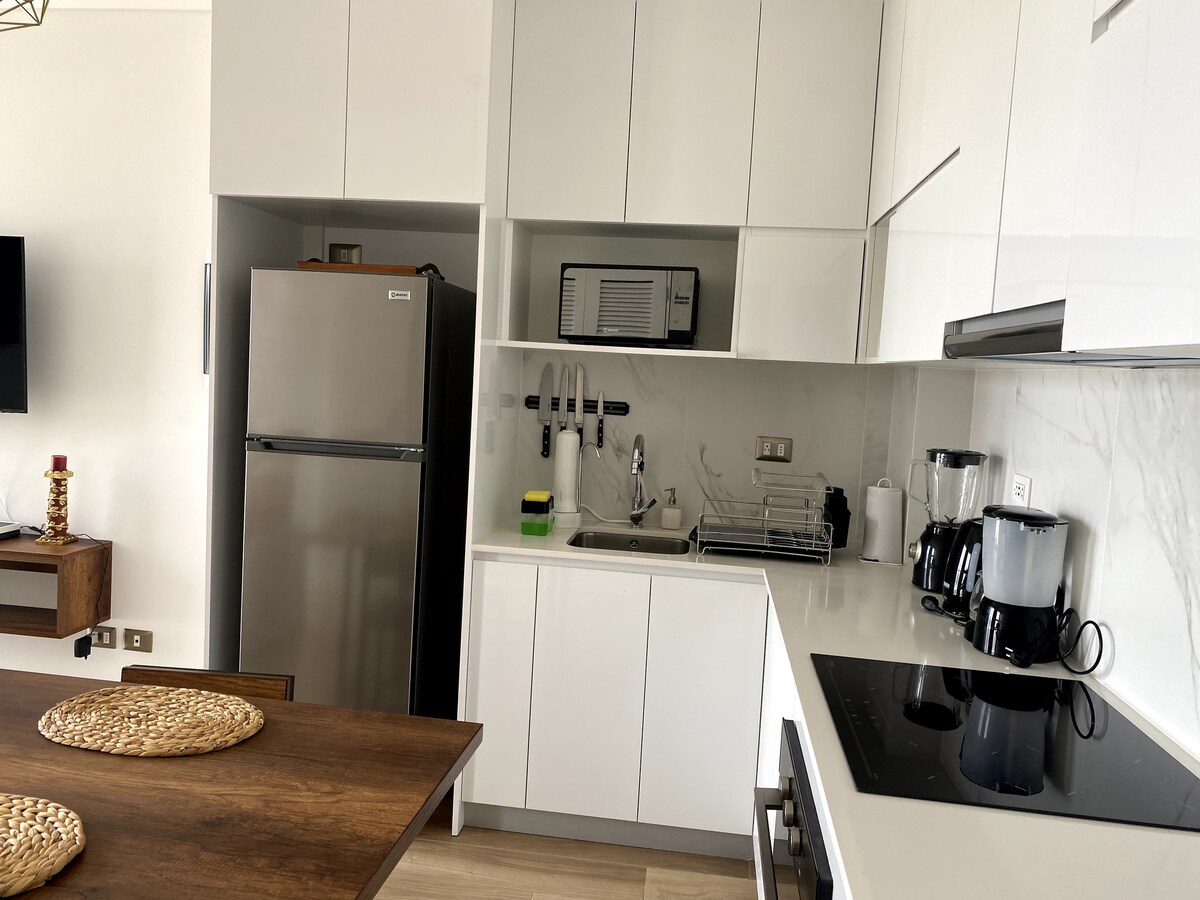 Apsistokite PRABANGIAME bute pačioje Barranco širdyje!🌆✨ Šis modernus 8-o aukšto butas puikiai tinka ieškantiems komforto. Jame yra DVIGULĖ lova🛏️, privatus vonios kambarys, oro kondicionierius, pilnai įrengta virtuvė su oro gruzdintuvu🍟, išmanusis televizorius🖥️, balkonas su daliniu vaizdu į gatvę ir didelės spartos šviesolaidinis Wi-Fi. Vos keli žingsniai nuo pėsčiųjų tako, naujojo Puente de la Paz ir MAC.🌊 Puikiai tinka atsipalaiduoti ir atrasti tai, kas geriausia Barranco.🤩