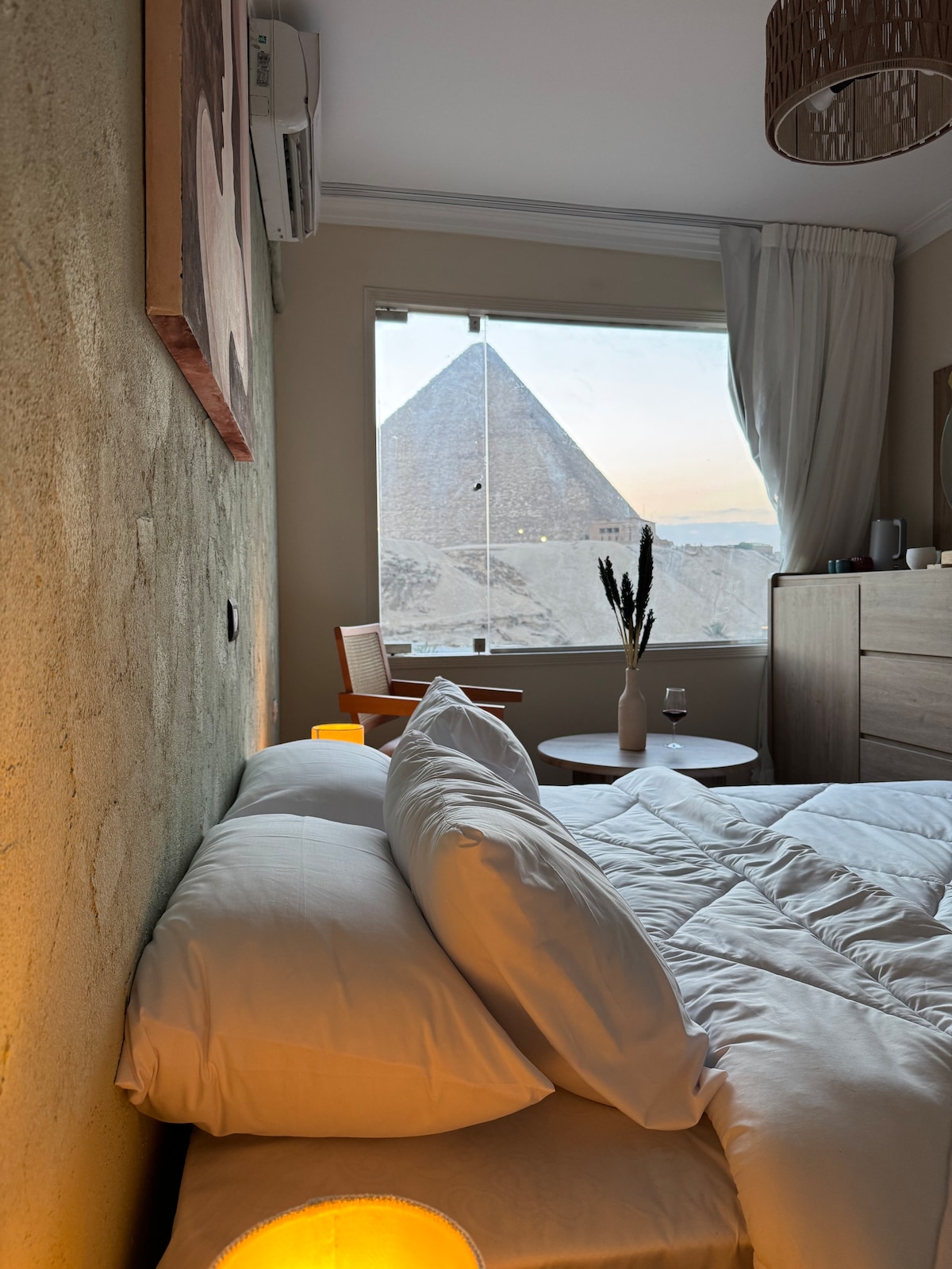 Atsipalaiduokite šiame prabangiame stogo kambaryje su panoraminiu vaizdu į Didžiąsias piramides. Mėgaukitės karališku komfortu gražiai įrengtoje erdvėje, kurioje dera moderni elegancija ir Egipto žavesys. Vos už 12 minučių kelio nuo naujųjų Piramidžių vartų ir už 10 minučių kelio nuo Didžiojo Egipto muziejaus, tai puiki vieta tyrinėtojams. Viską turinti virtuvė ir didelė terasa užtikrina nepamirštamą viešnagę.