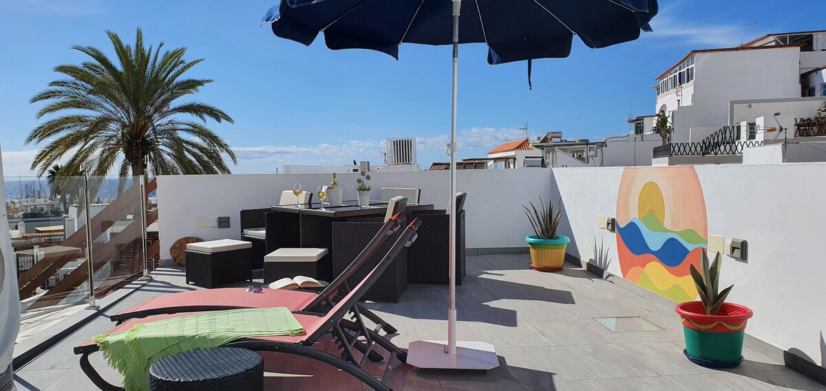 Puikus butas Puerto de Mogane. Vos už 50 metrų nuo paplūdimio! Erdvus, šviesus, oro kondicionierius, didelė terasa su saulės lovomis, virtuvė, stogo terasa su puikiais vaizdais ir saulės lovomis. Centrinis, bet tylus. Puiki vieta atsipalaiduoti arba kaip bazė pažinti salą.