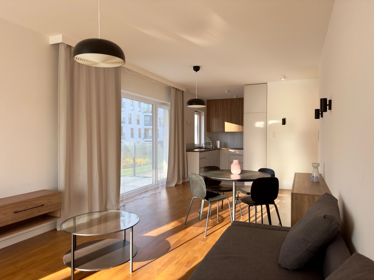 Jaukus, šviesus butas, puikiai tinkantis mažai šeimai su 1 vaiku arba dviem vaikais. - Buto aprašymas miegamoji sofa svetainėje yra puiki vieta ketvirtajam asmeniui. Pilnai įrengta virtuvė su virykle ir orkaite bei indaplovė. Yra du vonios kambariai, vienas su dušu ir vienas. - Trasportasions ir turgūs Gatvėje yra prekybos centras, Metro yra už 3 minučių kelio nuo buto, o autobusai - vos už 2 minučių kelio. Linkime puikios kelionės Varšuvoje 🥰