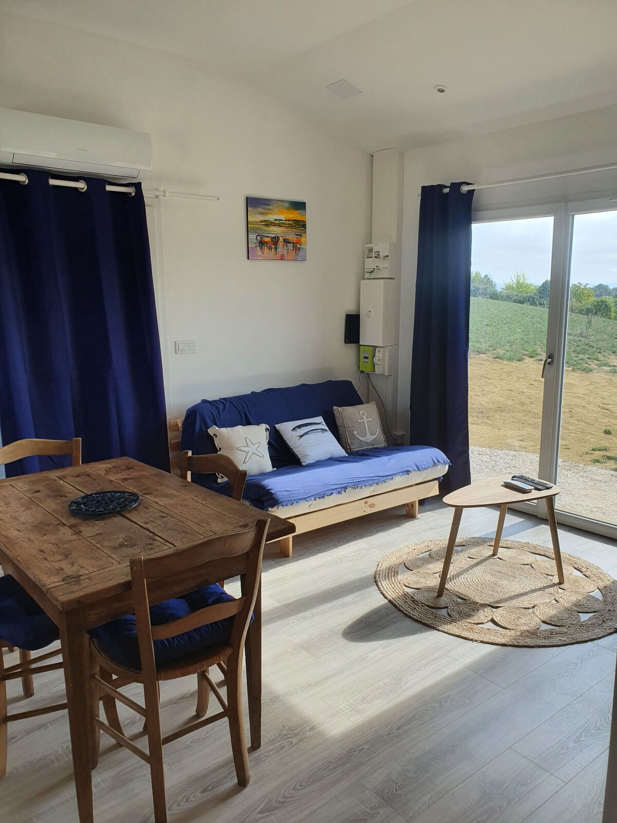 Modulinis kotedžas su 2 atskiromis erdvėmis. Apatinė dalis: 2 miegamieji ( tinka nuo 2 iki 3 asmenų), vonios kambarys ir tualetas, svetainė, virtuvė (indaplovė), pietų pusės terasa. Viršutinė dalis: 2 miegamieji , vonios kambarys ir atskiras tualetas. Patalynė ir rankšluosčiai neteikiami. Įkainis skiriasi priklausomai nuo svečių skaičiaus: daugiau nei 2, jis yra 8 eurais daugiau vienam asmeniui už naktį. Tvarkymo mokesčio nėra, tai turite padaryti išeidami. Kaimo širdyje yra visos parduotuvės.