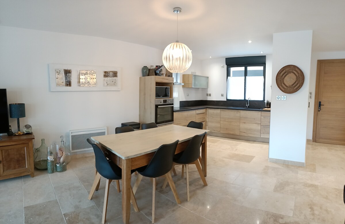 Villa de 80 m² habitable climatisée avec piscine individuelle à Molleges. Cette villa s'adresse à une famille de 2 adultes et 1 enfant maximum, un grand séjour et 2 chambres Parking privatif sécurisé. Lieu paisible, idéal pour se ressourcer et se reposer. La piscine sécurisée par une barrière est exclusivement réservée au locataire, elle n'est pas partagée. Nous vous informons que la piscine sera inaccessible pendant la période du 1er novembre a fin mars. Les crèmes solaire sont interdit .