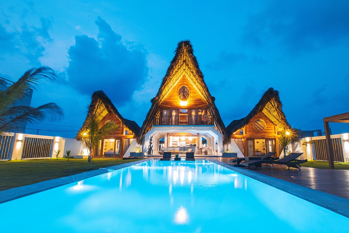Pabėkite į romantišką paplūdimio namą su privačia prieiga prie jūros ir išskirtiniu baseinu. Socialinė erdvė, kurioje yra svetainė su lubiniais ventiliatoriais ir televizoriumi, valgomojo zona ir pagrindinė virtuvė su elektrine virykle, atsiveria į lauką ir sukuria puikią atogrąžų atmosferą. Tiesiai priešais šią vietovę yra dengtas baseinas ir atogrąžų sodas. Atsipalaiduokite miegamajame su oro kondicionieriumi. Wi-Fi yra visame name. Puikiai tinka poroms, ieškančioms privatumo ir ramybės paplūdimyje.