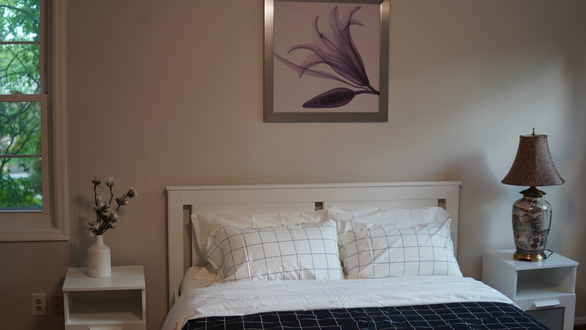 Mėgaukitės jaukia ir privačia viešnage šiame dideliame, atskirame rūsio liukse su atskiru įėjimu. 1,9 mylios iki metro! Puikiai tinka poroms, pavieniams keliautojams arba mažoms šeimoms. Jame yra patogus miegamasis su plačia dvigule lova, gerai apšviesta, erdvi svetainė (6 x 3 m), sofa, kurią galima paversti dviem atskiromis lovomis, ir vonios kambarys su atskira dušo kabina. Televizorius (su „Roku“ ir „YouTube TV“) suteikia daugybę pramogų, o jūs galite mėgautis kava ir arbata poilsio kampelyje, kuriame yra kavos aparatas, elektrinis virdulys ir visi reikalingi indai.