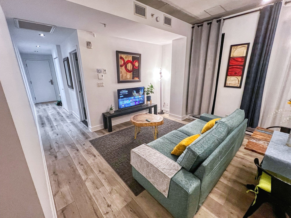 Mėgaukitės viešnage pačioje miesto širdyje! Visiškai nauja TDC 2 miesto centro prabanga su tiesiogine prieiga prie Bell Center! Mėgaukitės komfortu mūsų pilnai įrengtame ir įrengtame vieno miegamojo kondominiume su atskiru balkonu! Į jūsų viešnagę įeina pirtis, baseinas, sporto salė, stoglangis, žaidimų kambarys, poilsio kambarys ir terasa su keliomis kepsninėmis. Nemokama požeminė stovėjimo vieta su metro vos už kelių minučių kelio. Neišėjus į lauką, miestą galite apžiūrėti jūs. Be to, atsipalaiduokite su nemokamu Netflix, kad viešnagė būtų tobula