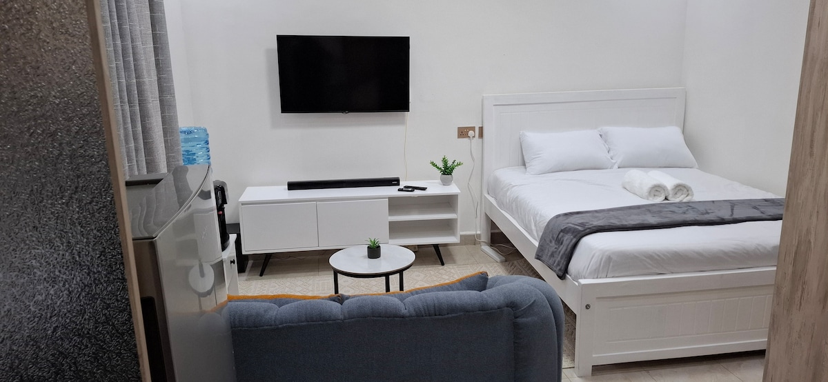 Hapiplace yra jauki ir stilinga studija Ruakos saugioje JT mėlynojoje zonoje. Pasiūlymai: • Dvigulė lova ir privatus balkonas • Pilnai įrengta virtuvė • Greitas Wi-Fi, Netflix ir YouTube Premium • Baseiną, sporto salę ir biliardo stalą • Greitaeigius keltuvus ir nemokamą automobilių stovėjimo aikštelę Tik 10 minučių kelio nuo „Two Rivers“ prekybos centro, 15 minučių kelio iki JT/JAV ambasados, 30 minučių kelio iki Nairobio verslo centro ir 35 minutės kelio nuo oro uosto greitkeliu. Nairobio nacionalinis parkas yra už 50 minučių kelio.
