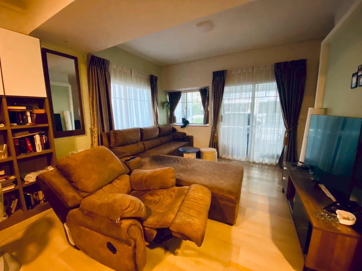 Centro Bangna yra moderni 2 aukštų atskira gyvenamoji vila, esanti BangNa Villa rajone, vilų kompleksas su viso namo apsaugos signalizacijos sistema ir dvigubais vartais visą parą.Didžiausias Bankoko prekybos centras „Mega Bangna“, „IKEA“ ir „Big C“ prekybos centras yra už 1,5 km, o užkandžių gatvė - už 1 km.Už 20 minučių kelio automobiliu nuo Tailando vietinių gyventojų traukinių ir Devynių imperatorių parko.Pusvalandis nuo Suvarnabhumi oro uosto.Nemokamas paėmimas ir išlaipinimas ilgesnėms nei 3 dienų viešnagėms ir nemokamas paėmimas bei išlaipinimas ilgesniam nei 7 dienų laikotarpiui. Tikimės, kad galėsite atsipalaiduoti ir mėgautis atostogomis su šeima ir draugais mūsų ramiuose namuose.
