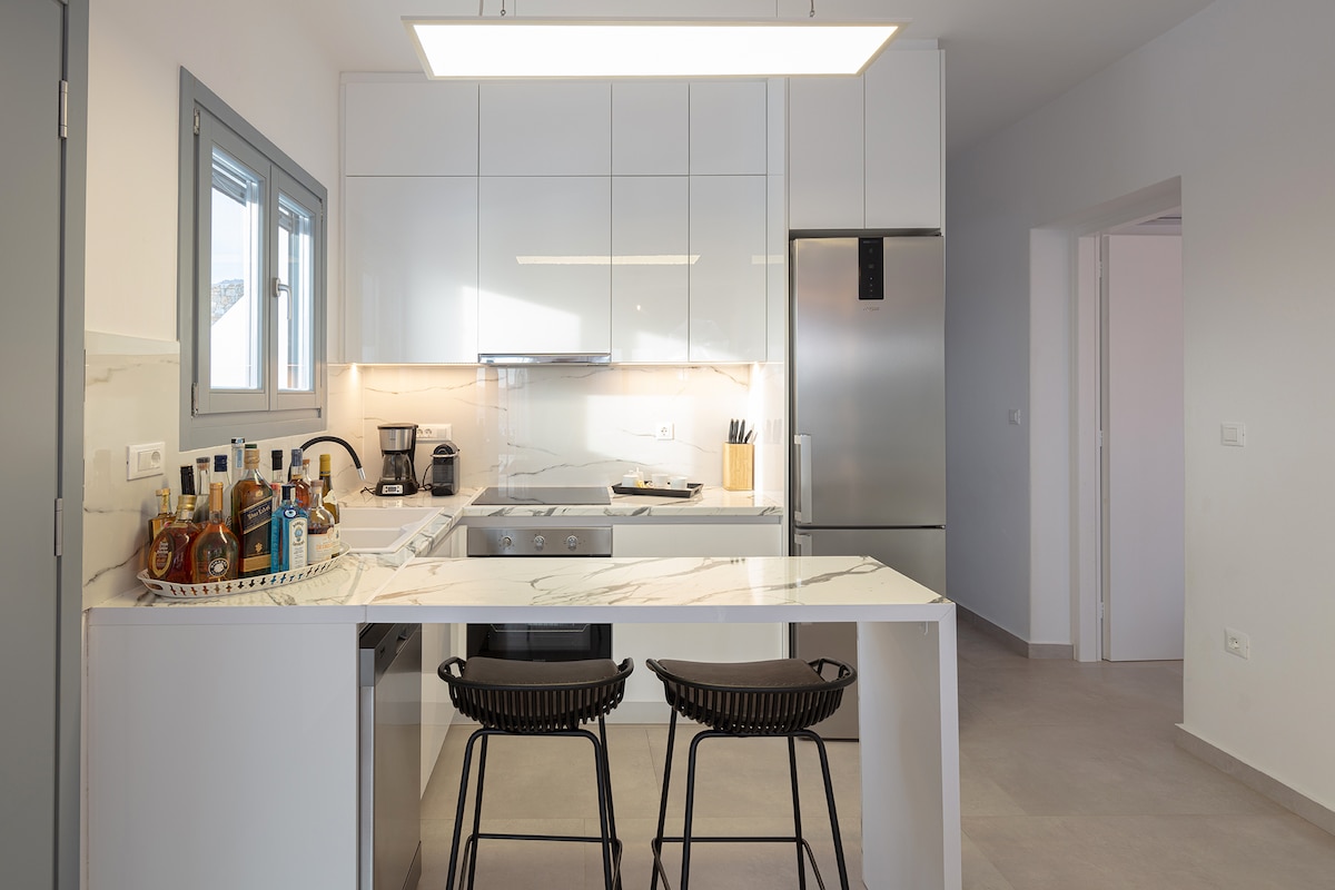Gražiausias 360 laipsnių vaizdas. Esame 7 min. pėsčiomis nuo miesto centro arba 2 min. automobiliu nuo kelio. Yra privatus didelis balkonas, kuriame galite būti lauke ir mėgautis gražiu vaizdu į jūrą ir sodą. Taip pat yra projektorius jaukiems vakarams, kad svetainė taptų patogiu namų kino teatru – puikiai tinka atpalaiduojantiems atostogų filmų vakarams! Wi-Fi kikladinė arcitektūra židinys Vieta pastatyti automobilį