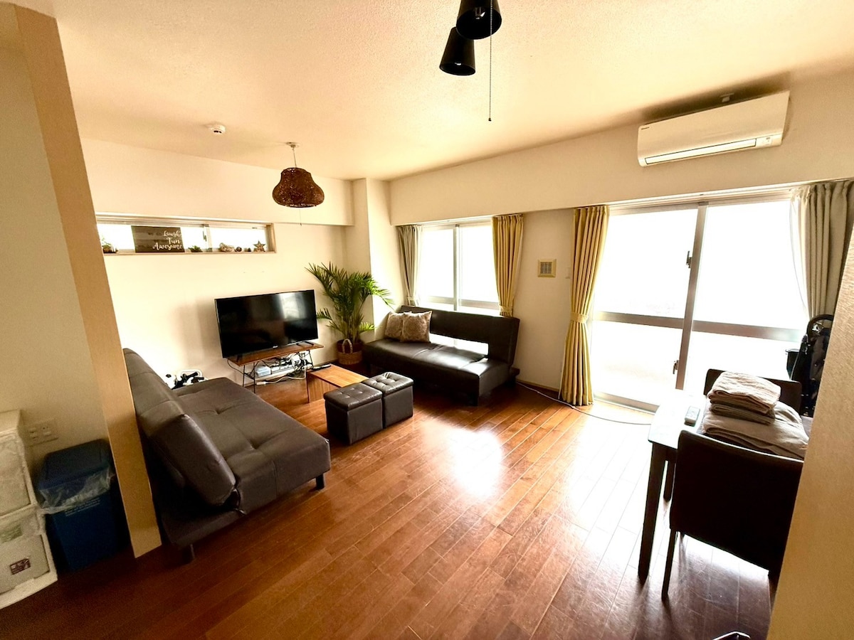 ✴︎ Attention✴︎ A demolition work started in the neighborhood as of late Feb 2026 Noise will be occurred. === This 1LDK apartment is located one block behind Route 58. Ideal for family or small group. 400m from Kencho-mae (Prefectural office) station (6 stations from airport). Basically 2 single futon sets(max 3sets are available). If you wish to share your bedding with your child, she/he is free of charge (if you have 2 such children, please count them as 1 adult and order 1 more bedding).