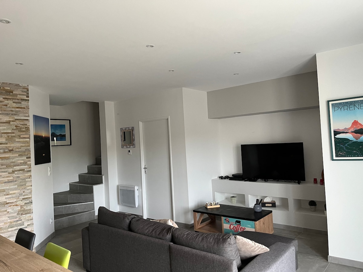 Tarp jūros ir kalnų (pasirinkimas per 1 valandą automobiliu), Bearnaise kaime, 15 min. nuo PO centro, atvykite ir mėgaukitės Bearnaise kaimo ramybe šiame mažame mediniame name, pastatytame 2021 m. Jums patiks didelis sodas ir daržovių sodas, kuriuo pasidalysime su mumis. Viduje - medžiagų derinys. Jei norite pasivaikščioti ar važiuoti dviračiu, nedvejodami kreipkitės į mane patarimo, nes iš mūsų regionų atsiveria turtingo kultūros ir architektūros paveldo vaizdai į turtingą kultūros ir architektūros paveldą.
