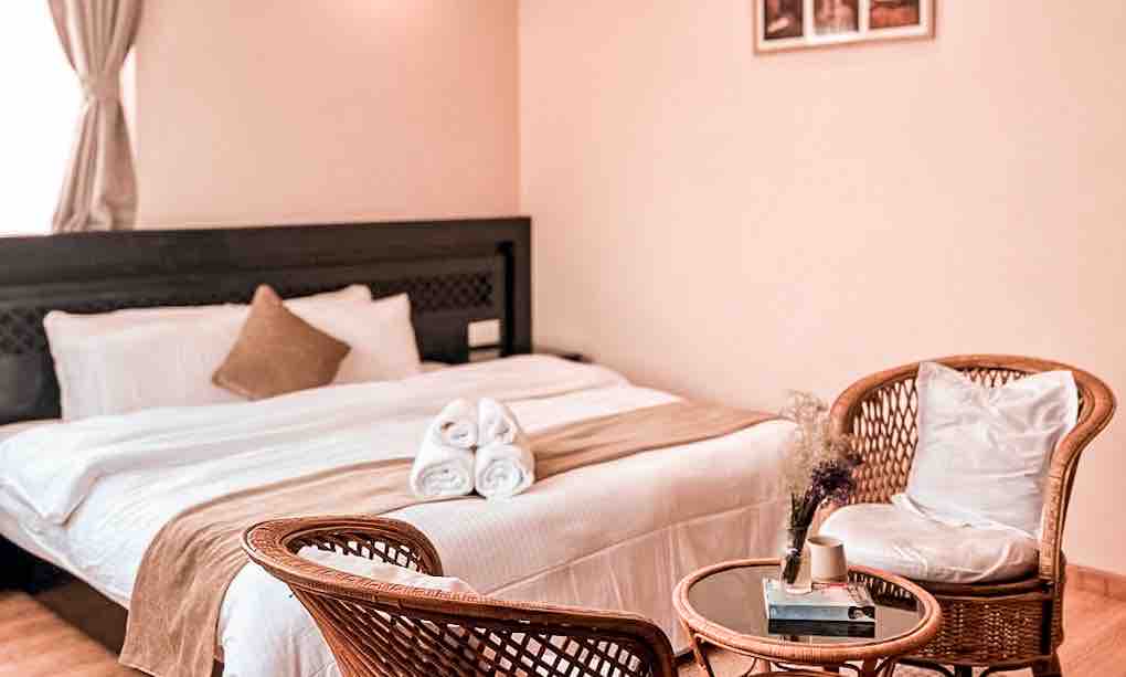 Perfect for solo travelers, couples, remote workers - looking to unplug and unwind. Perched on a scenic hilltop, this fully private apartment offers peace, comfort, and views of forests, hills, and mountains. Perfect for those seeking quiet. The space is fully equipped for short/medium stays, with 2 beds, kitchenette, hot shower and dining area. Guests can also enjoy hotel amenities just steps away: a restaurant with home-cooked meals, gardens, a fireplace, and outdoor games like badminton.