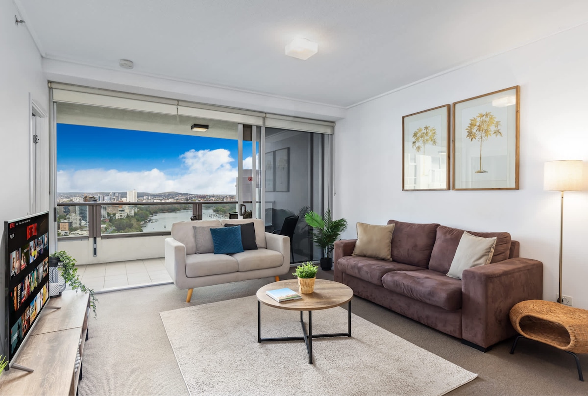 Atsipalaiduokite mūsų gražiame 3 miegamųjų 2 vonios kambario bute Brisbeno miesto širdyje. Mėgaukitės nuostabiais upės vaizdais iš mūsų balkono ir mėgaukitės buto siūlomu komfortu bei prabangiais patogumais. Virš 20 aukšto yra atviro plano virtuvė ir svetainė, pagrindinis miegamasis su dvigule lova, apartamentai ir tiesioginė prieiga prie erdvaus balkono, antras miegamasis su dvigule lova ir trečias miegamasis su 2 dvigulėmis viengulėmis lovomis. Pasiteiraukite didesnių grupių užsakymų, daugiau laisvų butų.