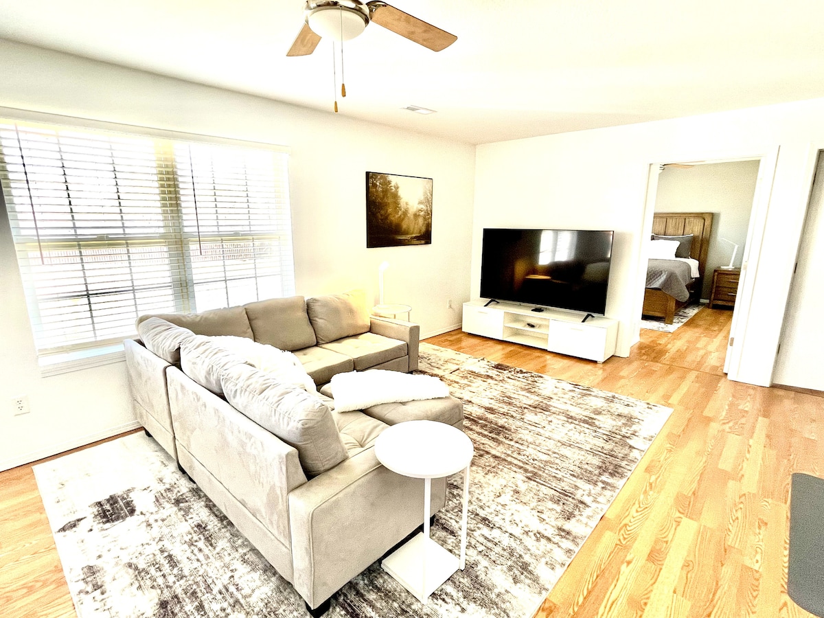 This treehouse features a gorgeous floor-to-ceiling stone indoor/outdoor fireplace, vaulted ceiling, and many large windows which provide natural light and beautiful views. The interior design fuses natural elements of wood and stone, with a more refined and polished urban country look. A partition wall creates intimate spaces w/in this large (950 sq.ft.) open floor plan. Highlights: king size bed, corner claw tub, rainfall shower, reading area, 65" TV, large deck, & BBQ grill.