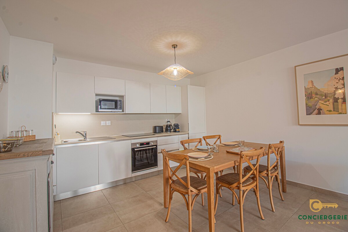 9 rue Massillon, vos už kelių kilometrų nuo Arènes de Nîmes, atraskite šį puikų ant stogo esantį butą su unikaliu žavesiu. Su atviromis sijomis, aukštomis lubomis ir balkonu jis sujungia seną charakterį ir modernų komfortą. Jo 2 šviesūs miegamieji ir oro kondicionierius siūlo ramią ir malonią aplinką, idealiai tinkančią ramiai viešnagei istoriniame centre. Reta vieta, kurioje dera autentiškumas ir artumas prie miesto lobių.