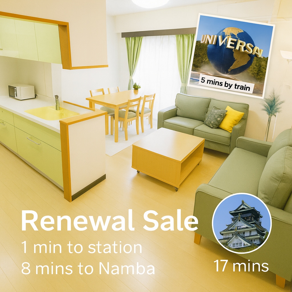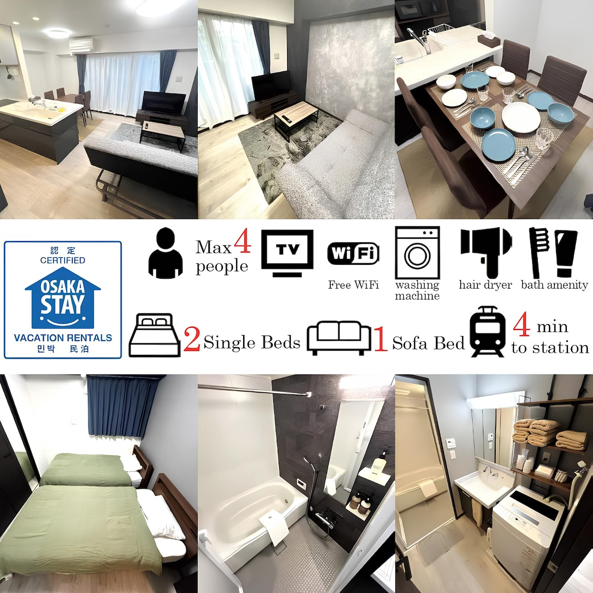 3 min. pėsčiomis nuo artimiausios stoties!Namba 6 minutės/USJ 18 minučių/Kyocera Dome 8 minutės/Netoliese yra daug būtiniausių prekių parduotuvių ir prekybos centrų! Ne daugiau kaip 3 žmonės