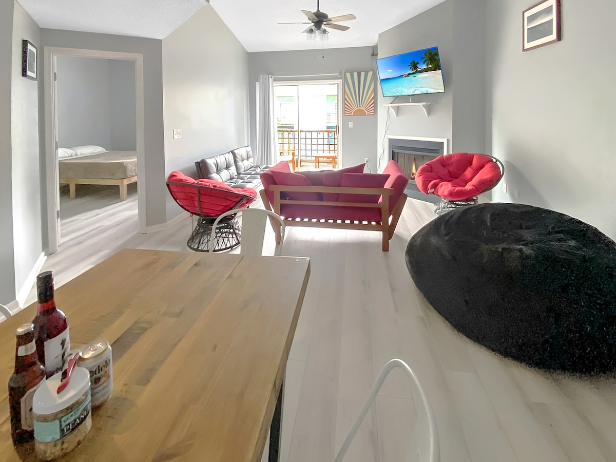 Šviežiai rekonstruotas paplūdimio kondominiumų rojus. Kai tik įeisite į šį gražų pakrantės sodybą - teminį kondominiumą įsimylėsite dekoru ir vaizdu į vandenyną. Miegamajame yra karališko dydžio lova. Už kampo rasite „Jack“ ir „Jill“ tualetą. Mėgaukitės naujai įrengtu pasivaikščiojimu duše. Virtuvėje rasite viską, kas reikalinga maistui ruošti arba išgerti atpalaiduojančiam vakarui apstatytoje terasoje su vaizdu į vandenyną. Patogu naudotis visais vietiniais patogumais.