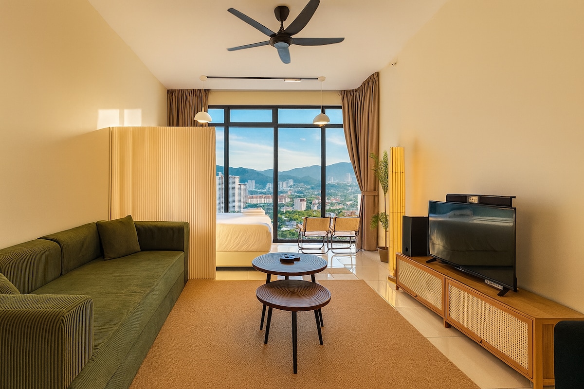 Mūsų 2 miegamųjų jaukūs apartamentai yra pačioje Penango širdyje ir lengvai pasiekiami vietinėms turistų lankomoms vietoms. Tai panašu į viešnagę viešbutyje su papildomais masažinės kėdės,virtuvės,skalbyklosir gražiu vaizdu į miestą. Puikiai tinka poroms, verslo keliautojams ir mažoms šeimoms. Jei esate alkanas, nesijaudinkite,japonų/korėjiečių restoranas ir 7-11 yra tik apačioje. Už 5 min. kelio pėsčiomis yra vietinis maistas „OldTown“,„Pizza“, „KFC“. Jei jums patinka rami ir jauki vieta šiame judriame mieste, jums patiks mūsų namai!