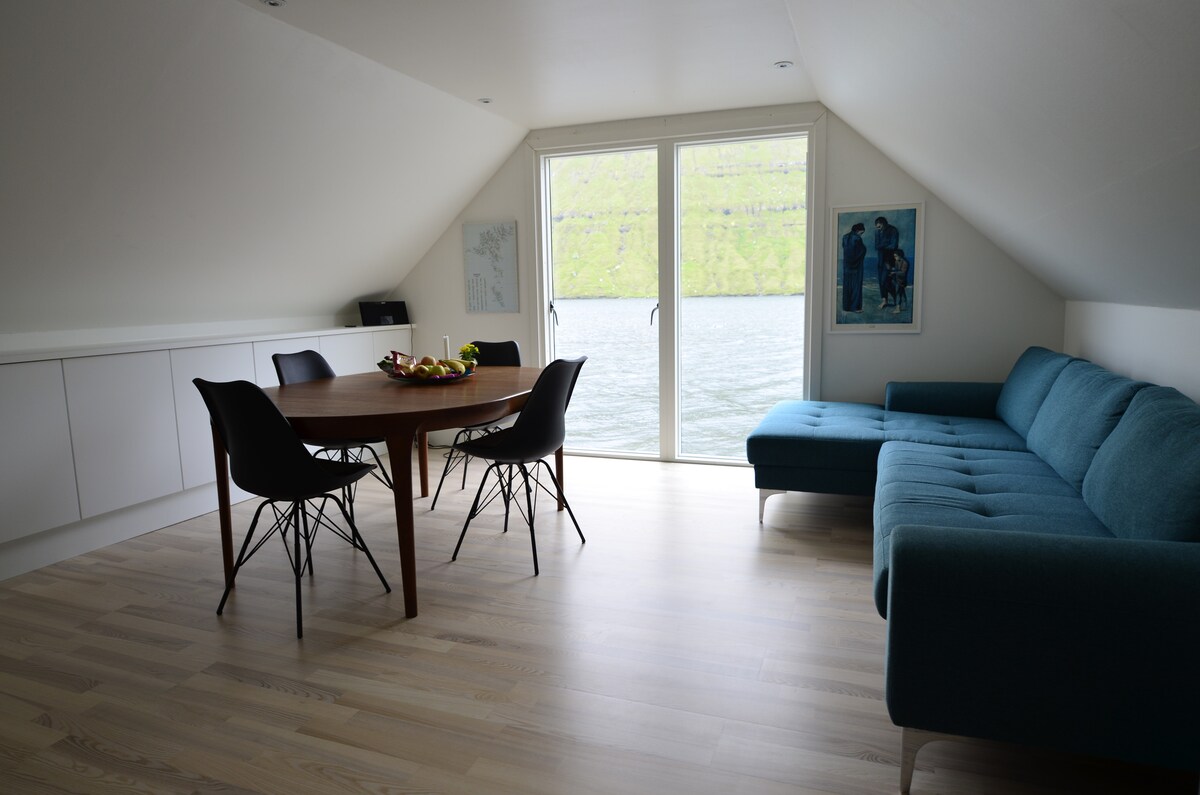 Tai puiki vieta patyrinėti šiaurines salas . Šiame 50 m^2 bute yra svetainė su virtuve, du miegamieji ir mažas vonios kambarys. Šalia jūros yra balkonas. Galite mėgautis gamta, vandenynu ir kalnais. Apačioje yra skalbimo mašina, džiovyklė ir šaldiklis. (Įjungti) Butas yra už Klaksviko miesto, apie 5 km nuo centro, ramioje ir idiliškoje aplinkoje. Atidarę langus pamatysite netoliese esantį upelį ir vandenyną.
